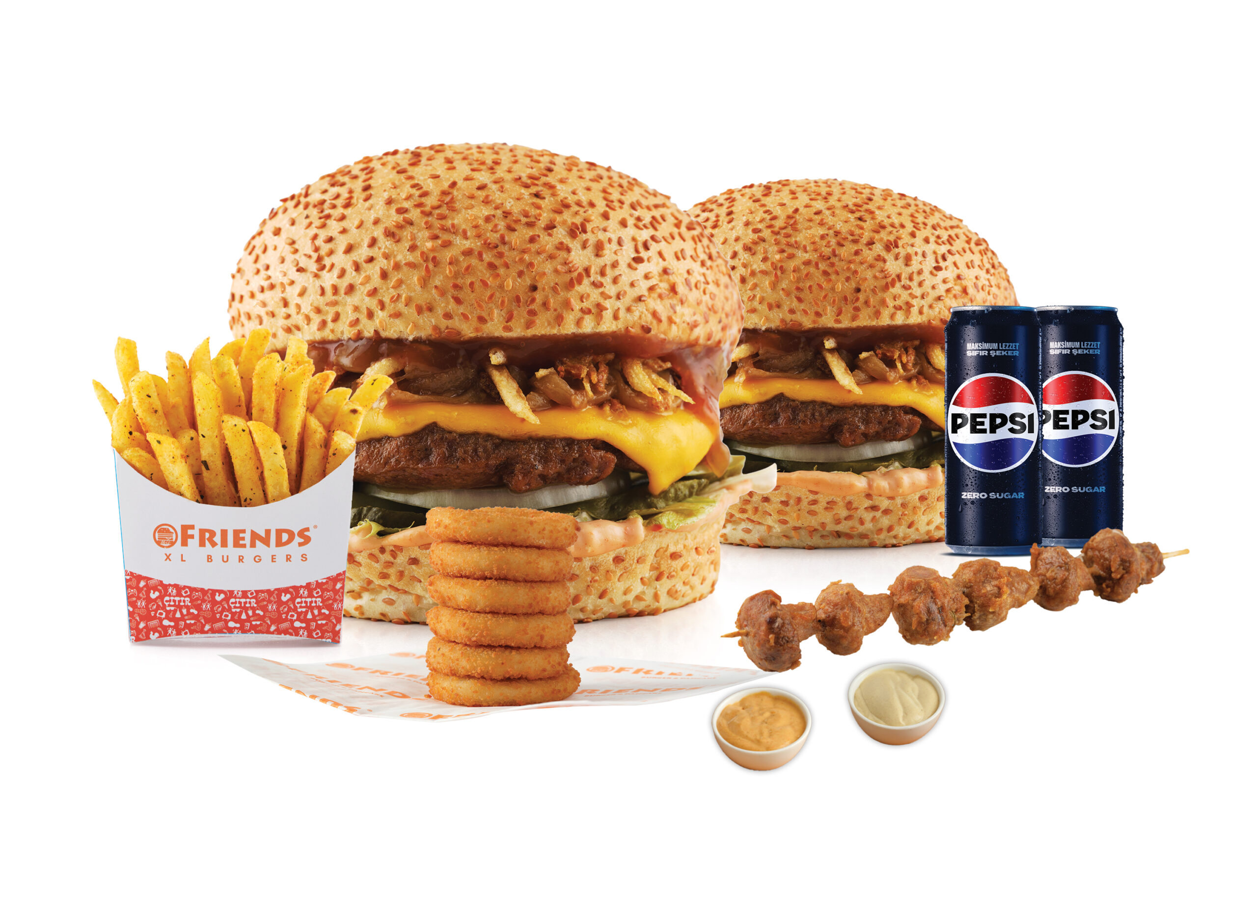 Seçeceğiniz 2 Adet Buffalo Burger veya Tavuk Buffalo Burger + Patates Kızartması (300 gr.) + 6 Adet Soğan Halkası + Friends Sos+ Ranch Sos +2 Kutu İçecek