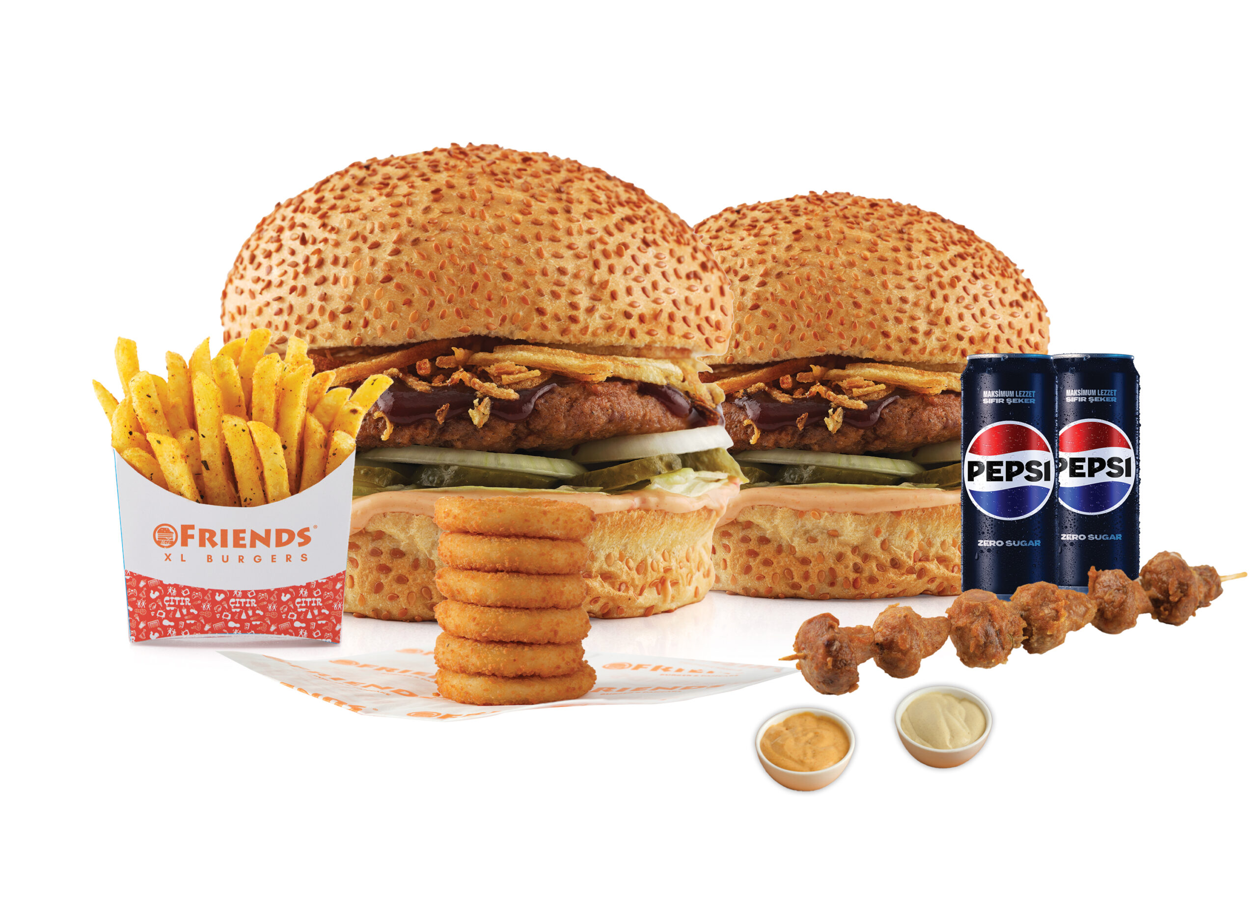 Seçeceğiniz 2 Adet Smoky Burger veya Tavuk Smoky Burger + Patates Kızartması (300 gr.) + 6 Adet Soğan Halkası + Friends Sos + Ranch Sos +2 Adet Kutu İçecek