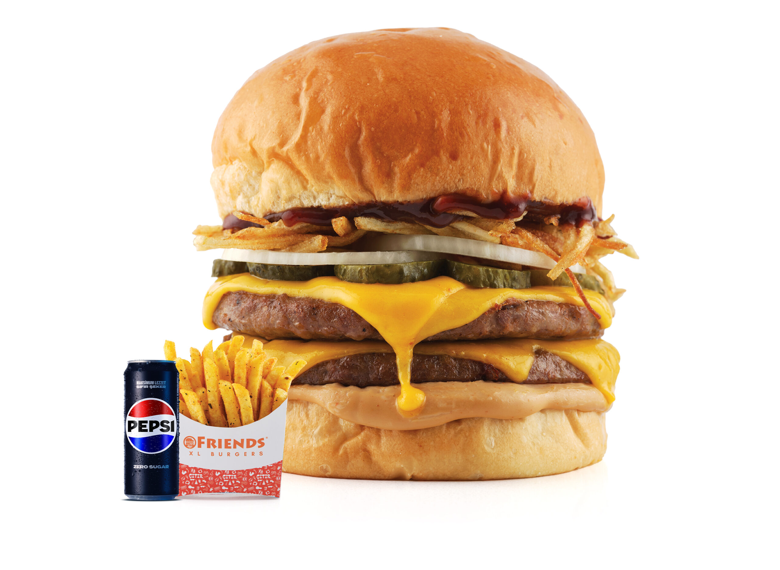 DOUBLE GURME CHEESE BURGER (Double %100 Dana Friends Köfte (240 gr), Brioche Ekmeği, Double Cheddar Peyniri, Kibrit Patates, Turşu, Soğan, Friends Gurme Sos), Patates Kızartması, İçecek