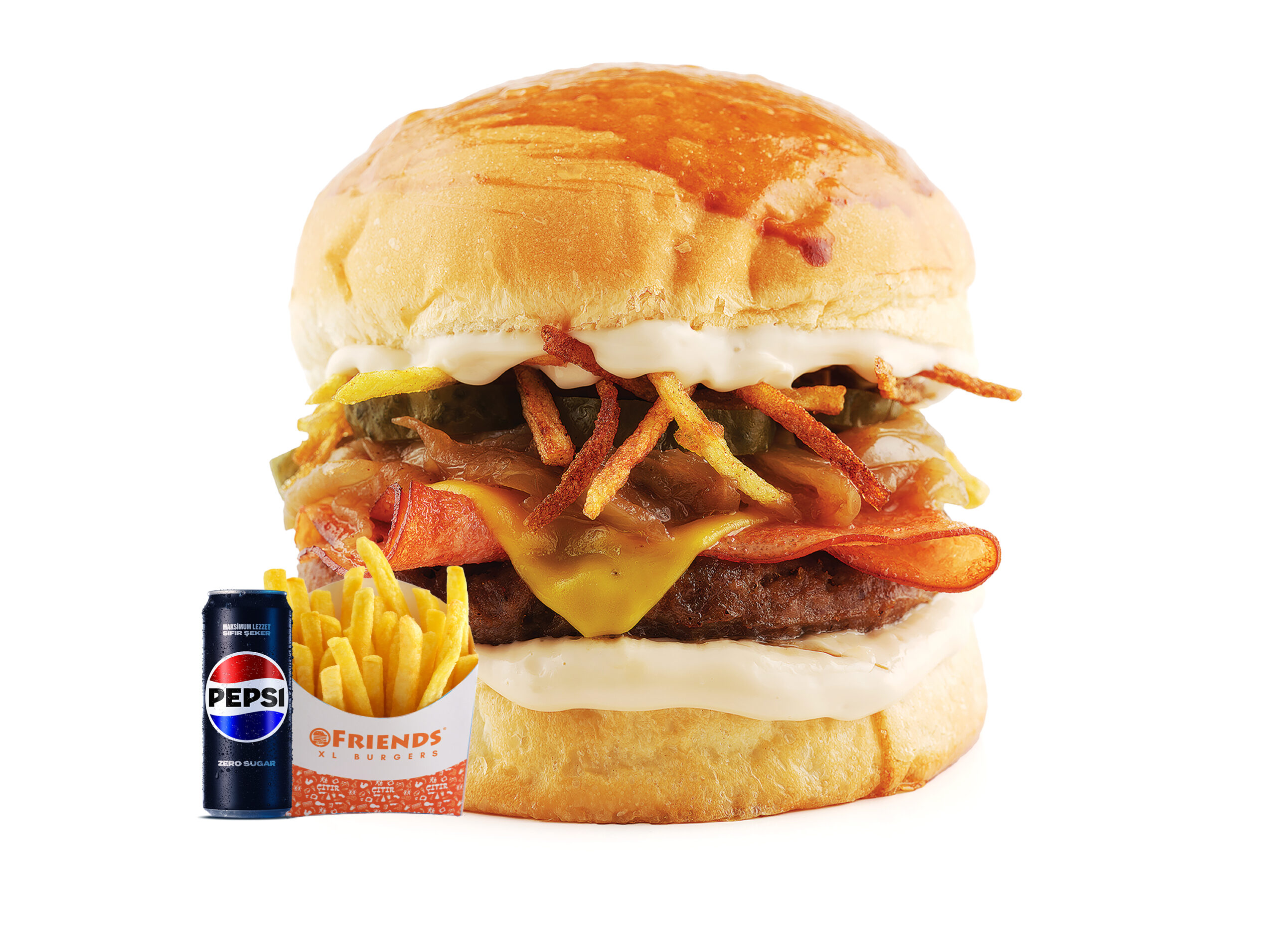 GURME FÜME BURGER (%100 Dana Friends Köfte (120 gr) Brioche Ekmeği, Hindi Füme, Kibrit Patates, Turşu, Soğan, Friends Gurme Sos), Patates Kızartması, İçecek